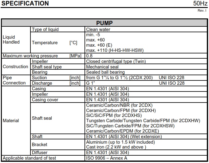 Bơm ly tâm inox Ebara 2CDX là dòng bơm ly tâm hai tầng cánh (twin impeller), được xem như phiên bản nâng cấp của dòng CDX với hiệu suất thủy lực cao hơn và khả năng tạo áp tốt hơn. Buồng bơm và các bộ phận tiếp xúc chất lỏng bằng inox AISI 304, giúp chống ăn mòn, bền bỉ và phù hợp nhiều môi trường nước.